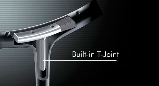 T-spoj, ki združuje ročaj in okvir loparja, je vgrajen globoko med grafitnimi plastmi, kar daje loparju trdnost in naredi lopar enodelen in brez trenja.