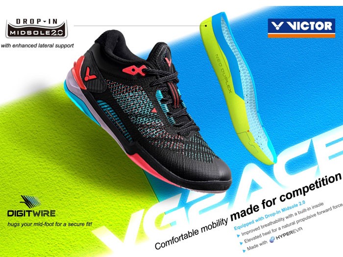 Vmesni podplat VICTOR Drop-In, je izdelan posebej na zahtevo igralcev badmintona. Ima ergonomski podporni sistem s tremi loki za izravnavo pritiska, katerega namen je zagotoviti izjemno podporo med dolgotrajno uporabo, zmanjšanjem utrujenost pri vadbi in povečanjem stabilnosti stopala. Na podlagi teh prvotnih prednosti je VICTOR zdaj predstavil naslednjo generacijo vmesnega podplata 2.0, ki je uporabljen v modelu Victor VG2ACE.